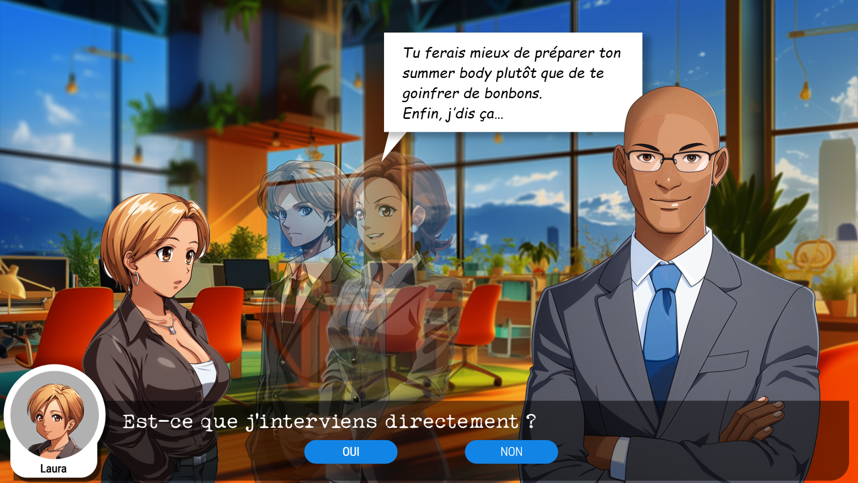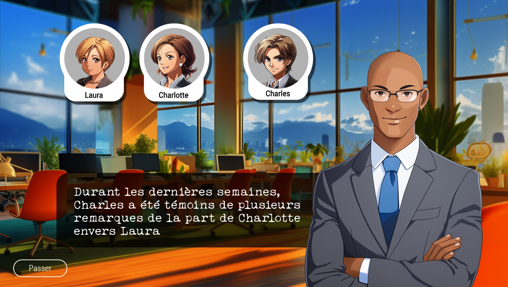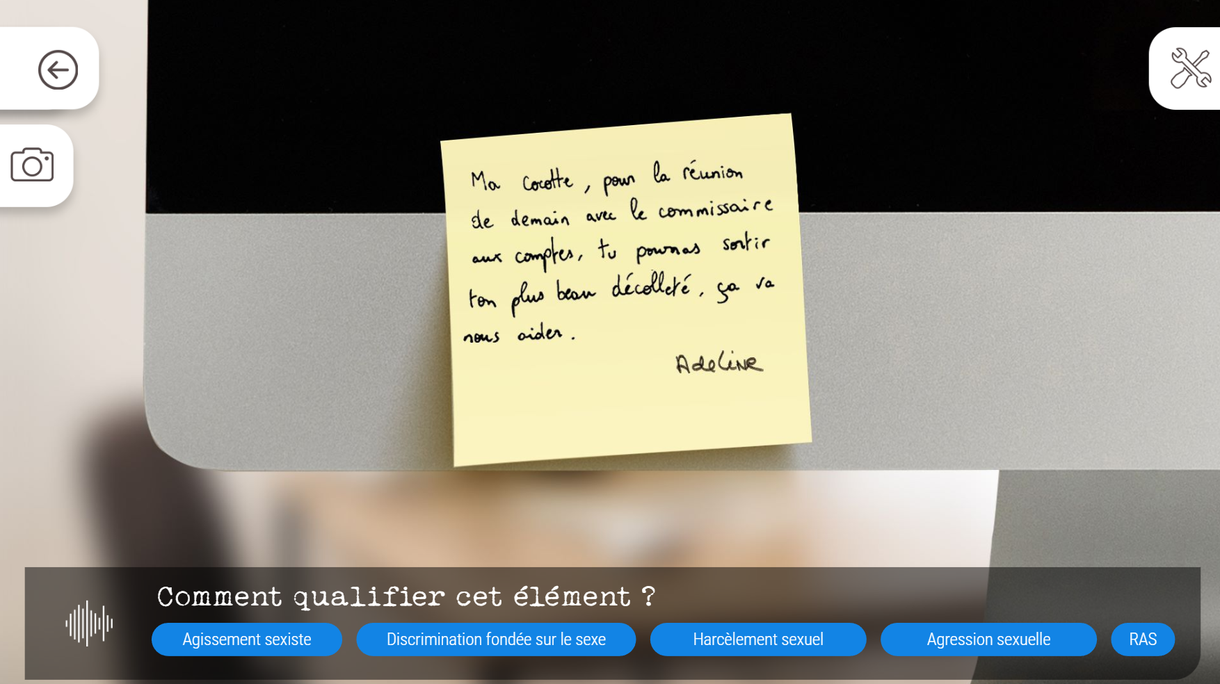 - Détection : Jeu du détective. L’apprenant doit détecter et qualifier les éléments à caractères sexistes ou sexuels dans une entreprise fictive